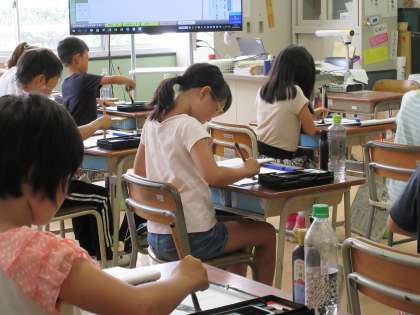 書道の時間です。最初に姿勢が大事です。背中をぴんと伸ばしてお腹と机の間は握りこぶし一つ分、呼吸を整えて、手本の「一」を書きましょう。トン、スー、ギュの要領です。