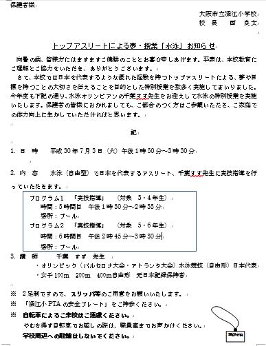7/3 千葉すず先生 水泳特別授業のお知らせ