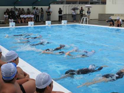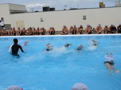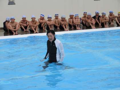 3・4年に続いて、5・6年が千葉先生の水泳指導を受けました。とても分かりやすく、すぐに役立つ指導ばかりでした。何より、千葉先生からパワーをいただいた5・6年生たちでした。