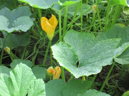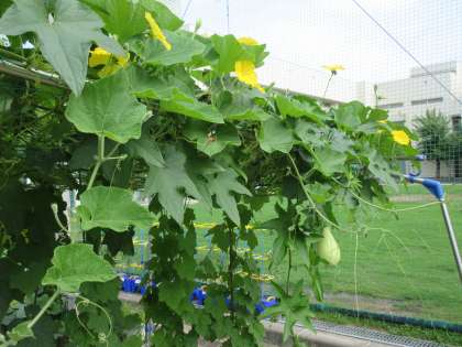 かぼちゃの花が咲いています。葉っぱでジャングルのようですが、受粉はどうなっているのでしょうか?ひょうたんは例年のごとく見事に生っています。