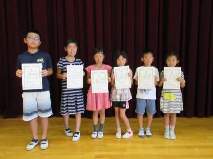 今日は1学期最後のふれあい集会の日です。最初に「夏休み生活標語」(東成区生活指導協議会)の賞状受賞式を行いました。学校長から賞状が授与されました。