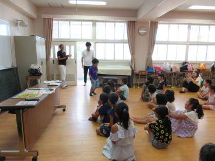 夏休みに入りましたが、午前10時からの特別授業「英語」の時間にあわせてぞくぞくと低学年の児童が多目的室に集まりました。