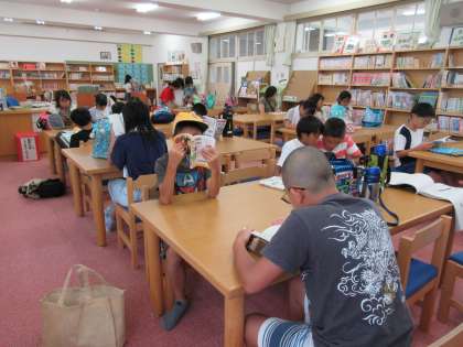 プール開放を終えた高学年の児童が、図書館で読書をおこなっています。静かに思い思いの本を手に取って読書する習慣が定着しています。