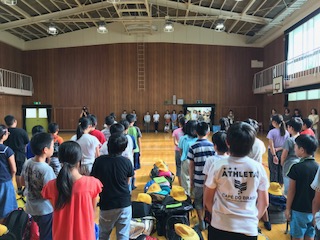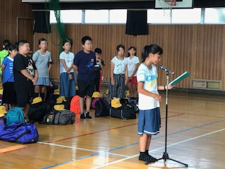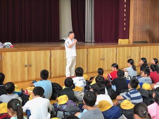 まず出発式で校長先生のお話を聞いて、見送りに来られたお家の方にあいさつをしました。