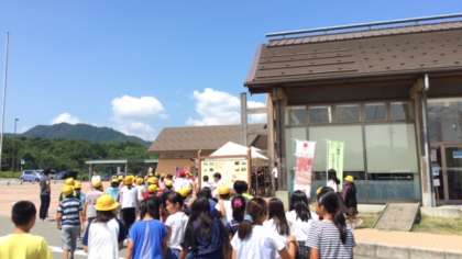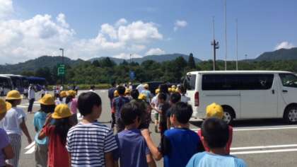 5年生の林間学習に向かうバスは、予定より少し早いですが、道の駅「但馬のまほろば」に到着しました。とても良いお天気で、5年生は全員元気です。
