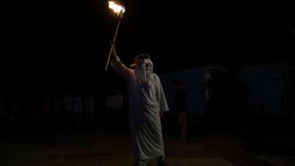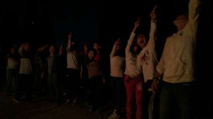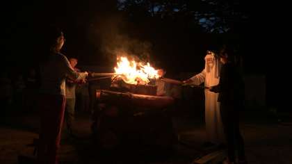 林間学習の一大イベントは「キャンプファイヤー」ですが、火の神様の登場でその幕が開きます。そして本物の火の神が降臨しました。児童の代表4人に「自由」「勇気」「友情」「愛」の火を与えられました。すると瞬く間にキャンプファイヤーの炎が大きく燃え上がりました。
