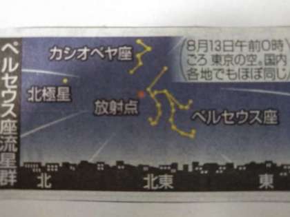 流星は12日午後9時過ぎから見えやすくなる。流星が現れる起点となる「放射点」は北東の空にあり、「放射点」から四方八方に星が流れる。「放射点」が高く昇る13日未明が観測のピークで、12日夜と13日夜、14日未明も適している。暗さに目が慣れるまで15分間くらい待つのがこつらしいです。