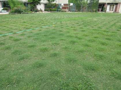 現在の校庭の芝生の状況です。2学期始業式の27日まで残り17日となりましたが、本校の管理作業員さんたちが一生けんめい芝生の生育に頑張っています。