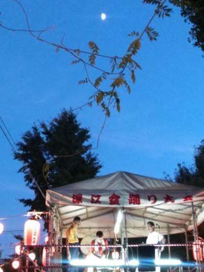 日が沈み、ふと夕空を見上げると半月がやぐらを照らしていました。