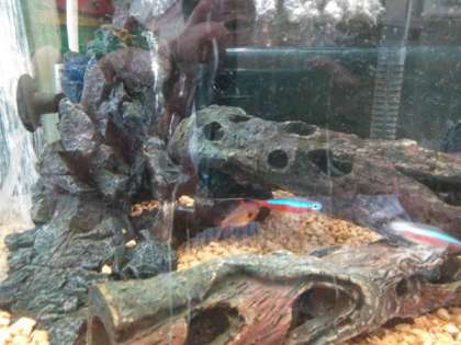 みなさんが飼育していた熱帯魚と金魚は今、どうしているのかと心配していませんか?元気にしています。夏休みの間は職員室にいて、先生方が飼育をしていました。ネオンテトラも金魚もご覧のとおりです。