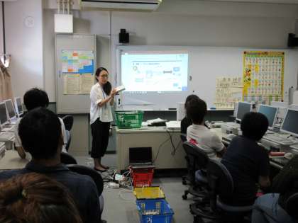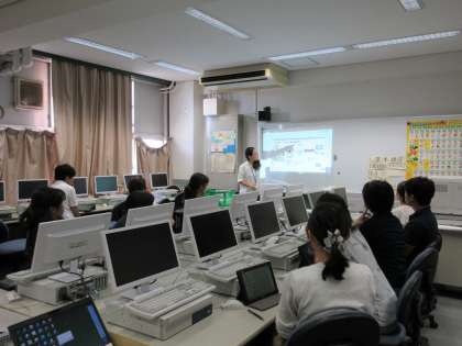 パソコンや大型ビジョンを活用した授業の進め方について、大阪市のICT教育専門員による研修を受けました。