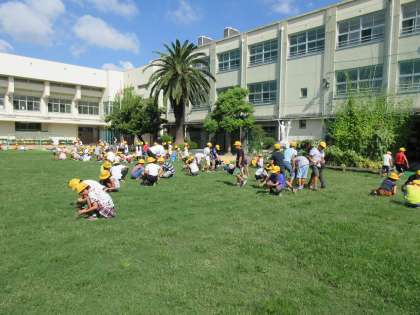始業式の後、全校児童で校庭の芝生の雑草取りをしました。一人二人では大変な仕事ですが、みんなでやれば早く終わります。