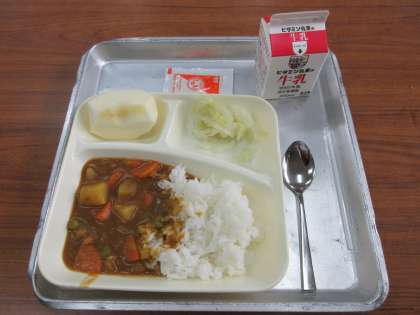 献立:ポークカレーライス(米粉)、キャベツのサラダ(ノンドエッグレッシング)、リンゴ、米飯・牛乳