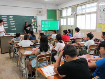 教育委員会より派遣されるC−netのタマラ・リチャーズさんの英語の授業です。今日はWhat day is it? What time is it now?などなど、1学期の英語の授業の復習です。『We can!』