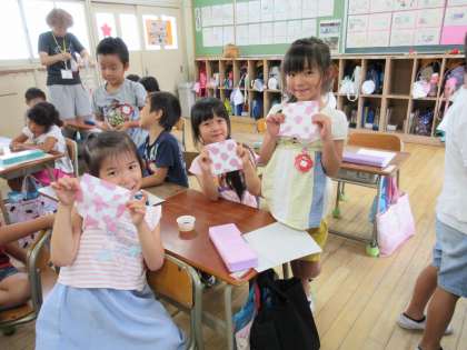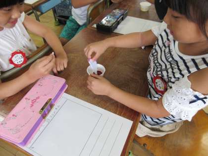 1年生がアサガオの花を絞って、その汁を絵の具にしてアートを作成しました。カメラを向けるととてもうれしそうな笑顔がはじけました。
