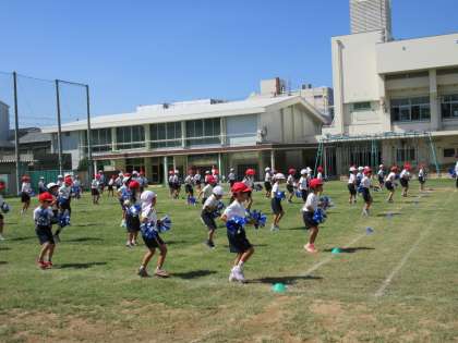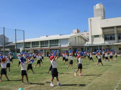 1・2年生の団体演技練習風景です。青空にキラキラ光るボンボンがとても映えます。