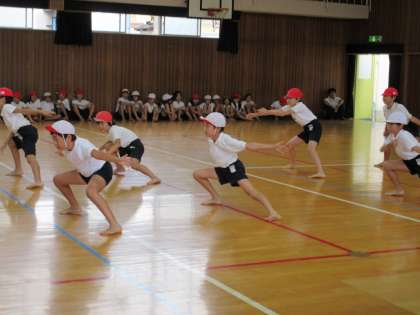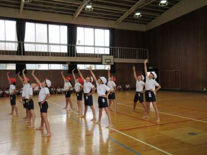 昨日からの雨で、合同演技の練習が体育館となっていますが、担任の工夫で上手に分かれて練習を進めています。
