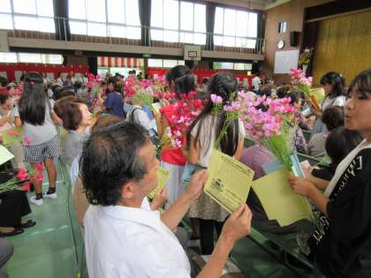 リコーダー演奏の後、4年生が参加された方々にお花(お祝いのメッセージ入り)のプレゼントをおこないました。