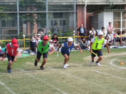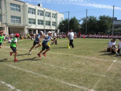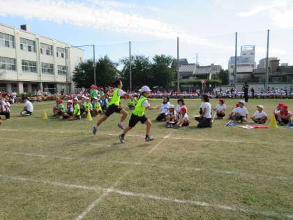 6年生による紅白対抗リレーです。リレー種目の最後を飾ります。白熱したリレーでした。