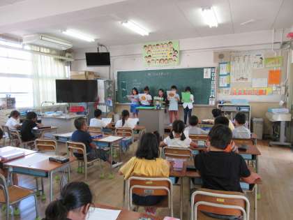 「朝ごはんの大切さに」ついての栄養教諭の授業です。児童が正面に立って、劇風にそれぞれに「早ね、早起き、朝ごはん」の大切さについてお話しをています。
