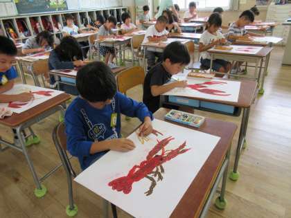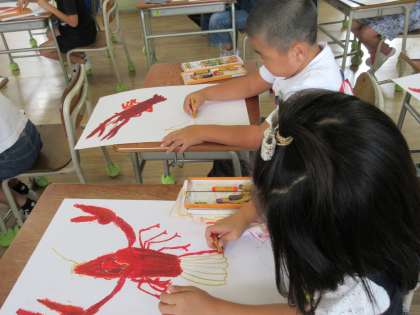 ザリガニの絵を書いています。これまでクラスで飼育、観察してきているのでとてもよく描けています。