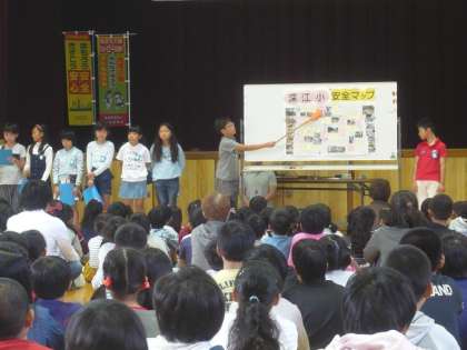 5年生の児童が説明している「深江小学校安全マップ」は、1学期に大阪府警本部と東成署、防犯協会深江支部と見守り隊の皆様と本校の5年生がフィールドワークをして作成したものです。