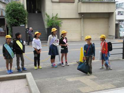 (写真:朝のあいさつ運動、創立50周年記念碑)