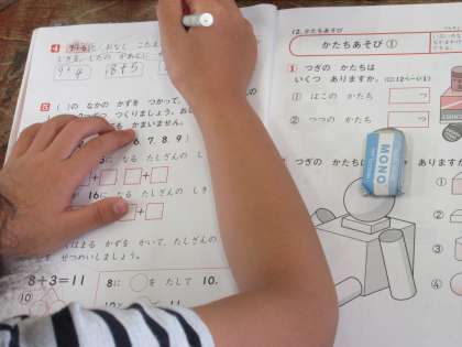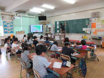 少人数で落ち着いた雰囲気の中、1年生の算数の授業が進められています。わかりやすく大型テレビの活用も全学年で行われています。