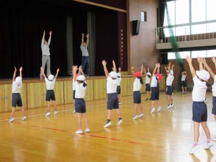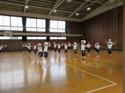 ラジオ体操第一を、正しく行えるように取り組んでいます。まっすぐ伸びた手、足先まで伸びた足、先生のお手本のようにしましょう。