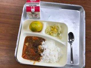 献立:ハヤシライス(米粉)、キャベツとコーンのサラダ、みかん、ごはん、牛乳