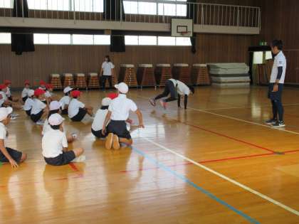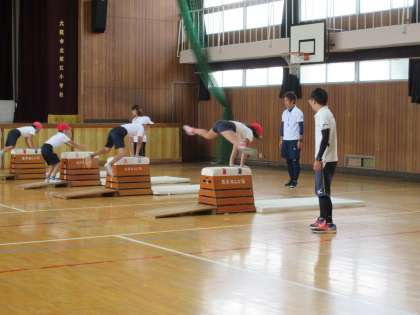 3年生の体育の授業で跳び箱運動をおこないました。本日の講師は東成区子どもの体力向上事業で派遣される体育専門指導員です。3人の講師が跳び箱運動の基本となるカエルとびから、馬跳びを体感させて、そして跳び箱運動に移りました。