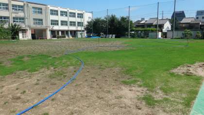 7月3日に植え付けをした芝生ですが根本の虫を狙うカラスに抜かれながらも、だんだん根を張り抜かれる数も減ってきました。平日の水やり等は学校の職員でしていますが土日は町会・施設開放の方々やPTAの役員・実行委員さんにしていただいております。