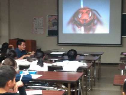 下の写真はなんだかわかりますか?「スズメバチ」を正面から見たところです。実際には危険なので、この大きさで見ることはできませんね。また、「アリジゴク」は何の幼虫なのかも教えていただきました。