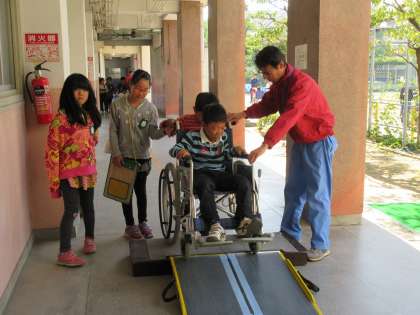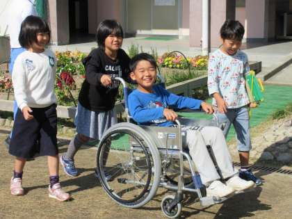 講堂で車いすの操作を学んだあと、実際に校内やグラウンドに出て車いすを体験しました。