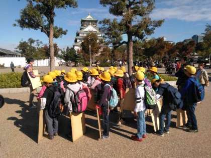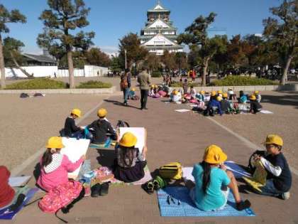 3年生が大阪城公園に写生会に出かけました。とても良い天気で、写生会日和です。現地で校長先生から『今の大阪城は昭和6年に大阪市民により再建された3代目で、豊臣秀吉の建てた初代の大阪城は今から400年前の大阪の陣の後に徳川氏により全部埋められています。』と説明を聞いて驚いた3年生たちでした。