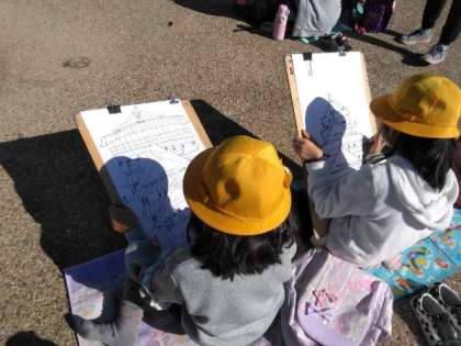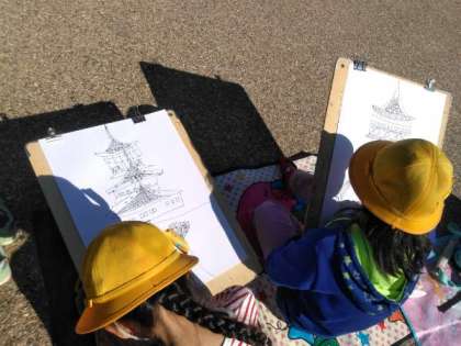 しっかりと大阪城を見ながら描いていきます。次第にお城が出来上がっていきます。どんな作品になるか楽しみですね。