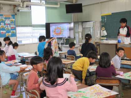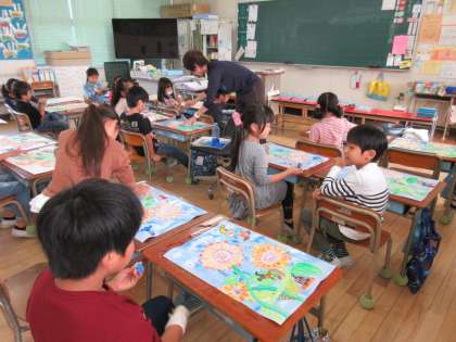 1年生の図工です。先日、下絵だったヒマワリの背景も描き出しています。だいぶ完成に近づいてきました。11月24日の作品展が楽しみですね。