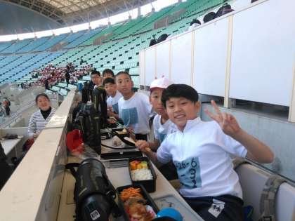 100m走が終わり、スタンドで昼食の時間です。今日はとても良い天気なので暖かく、すがすがしい中でお弁当です。