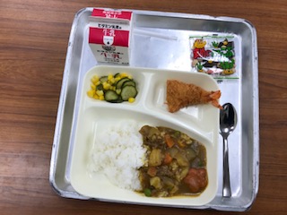 献立:エビフライカレーライス、きゅうりとコーンのサラダ、豆こんぶ、牛乳