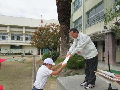 表彰式では学校長から、「試合が終わったらノーサイド、勝ち負けにこだわることなくお互いを讃え会いましょう。深江っ子はみんな仲間です。」とお話がありました。