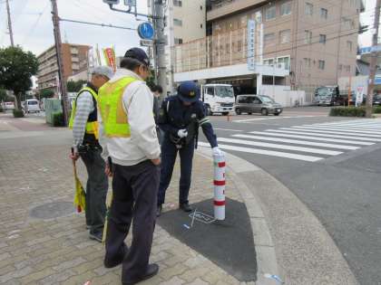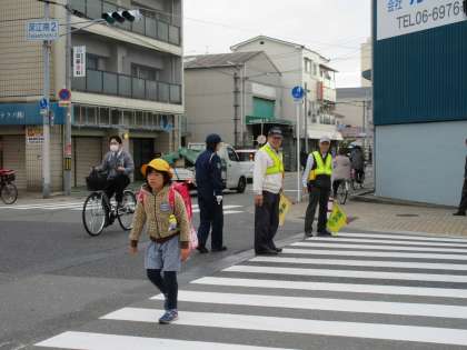 早朝より、地域の「見守り隊」の方と、東成警察署が一体となった交通安全指導をしていただいています。子どもの安全は日々の取り組みによって守られています。「いつもありがとうございます。」(学校長)