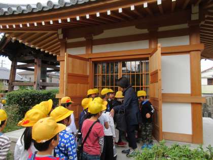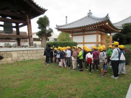 2年生が町探検に出かけました。まずは、深江にある有名なお寺「法明寺」を訪れました。法明寺は文保2年(1318年)に開かれました。大きな釣鐘が印象的でした。この鐘は深江の生んだ人間国宝の角谷一圭さんの作です。