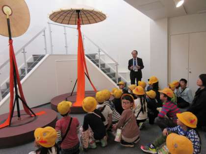 こちらでは今から45年前に伊勢神宮の遷宮の際に奉納された、御菅笠とおさしはの現物が展示されており、その大きさに驚いていた児童たちでした。