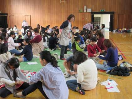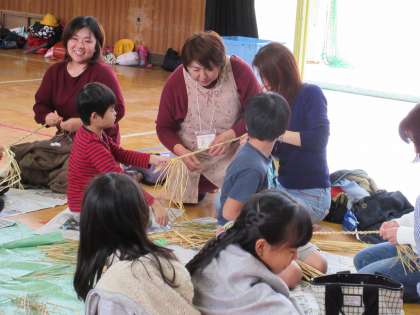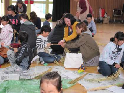 4年生が深江のほこり「菅細工」作りを学年集会で行いました。本日の菅細工はリースを製作しました。深江菅細工保存会の皆様のご指導で、参加した多くの保護者のみなさまと児童が行いました。
