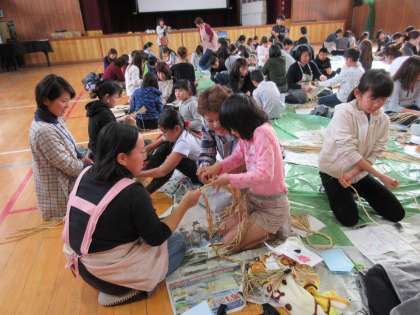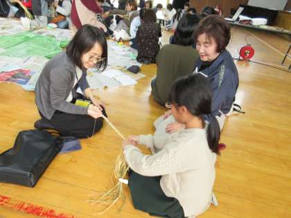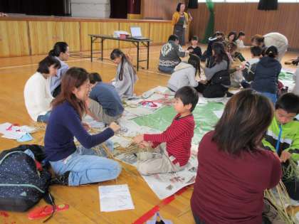 親子で協力して束ねた菅を編み上げていきますが、なかなか力のいる作業です。親子の息が合わないと上手くいかないようです。皆さんとても頑張っています。