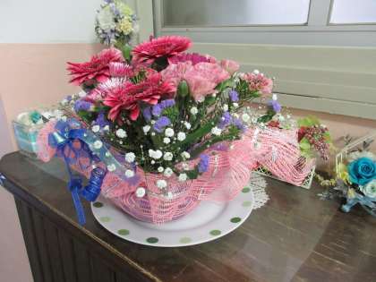 (写真:校長室の前のアートフラワーです。「とても美しいお花をありがとうございます。」)