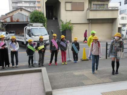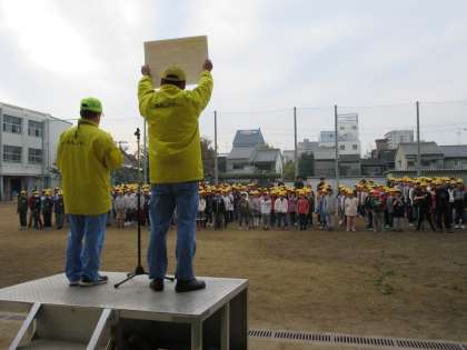 (写真)朝のあいさつ運動、東成区安全パトロールからのお話「5つのおやくそく」