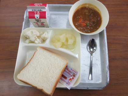 献立:ビーフシチュー、カリフラワーのピクルス、和なし(缶)、パン・牛乳
