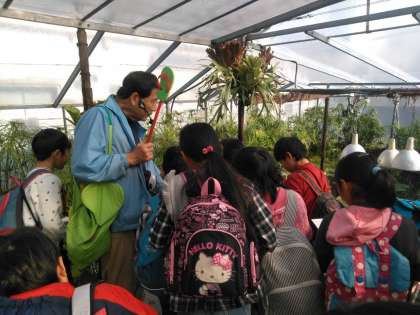 とても良いお天気の中、咲くやこの花館に到着すると、久山館長からの特別授業をしていただきました。まず温室を見学しました。熱帯などの植物が育てられていて、見たこともないような形の葉や実などが見学できました。