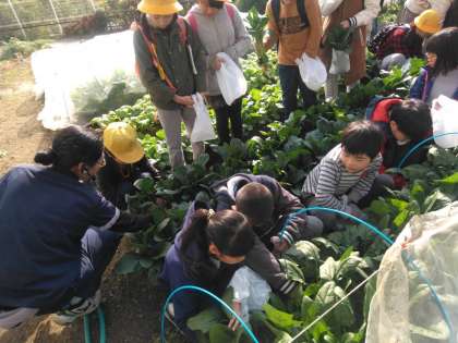 農園で育てられている小松菜とほうれん草の収穫体験をさせていただきました。全員おみやげとして持って帰ります。